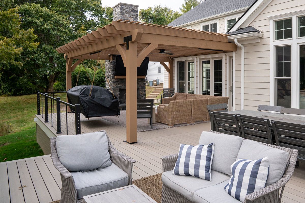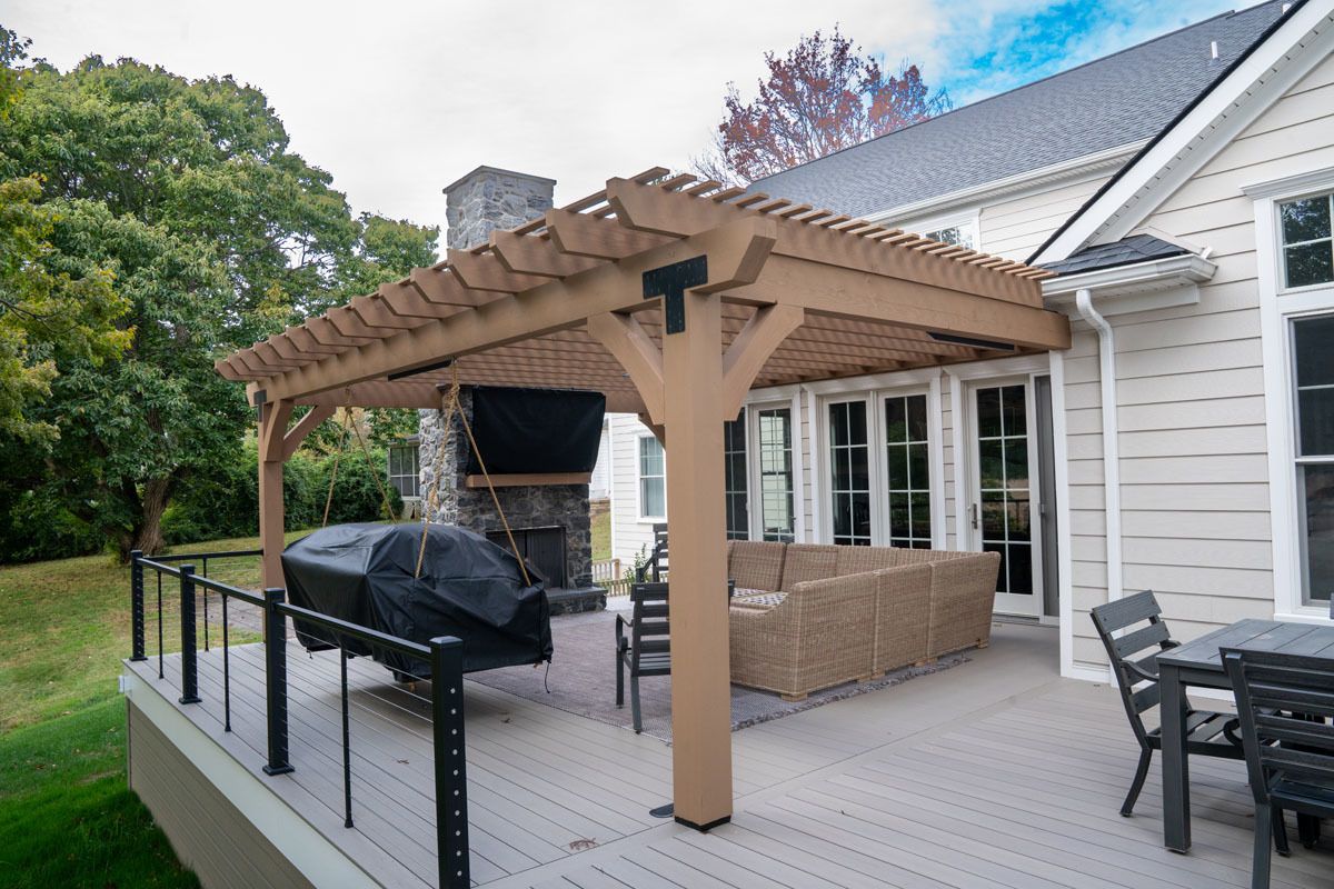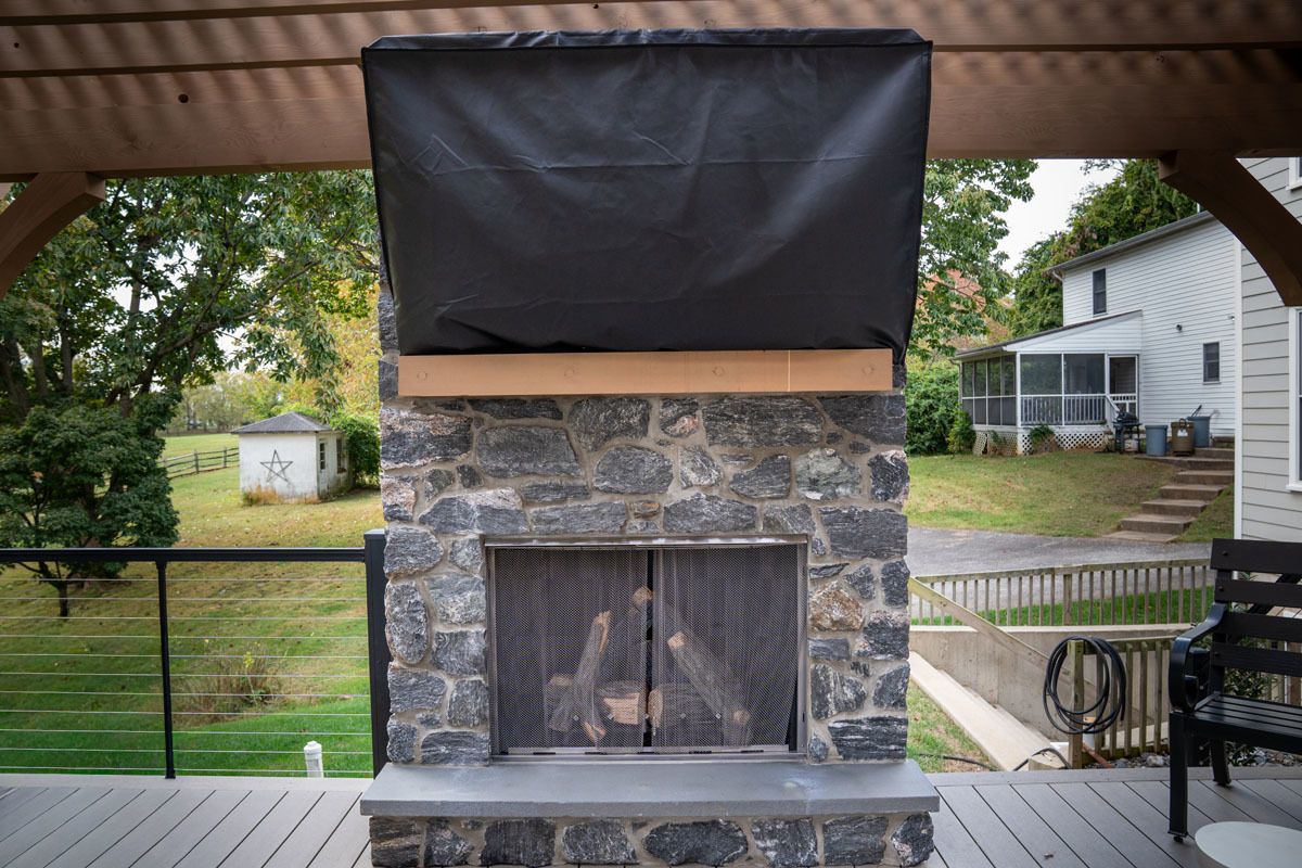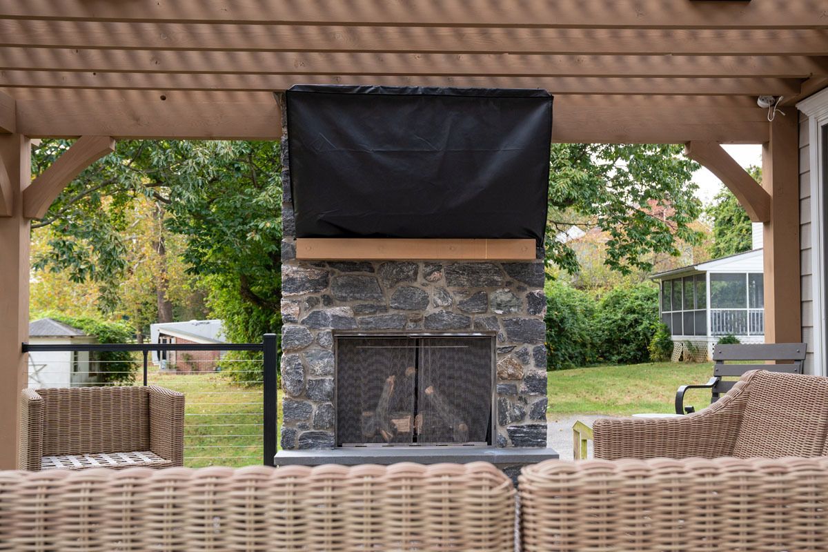 This project included the addition of a 16" x 24" tongue and groove Prestige wood ceiling. A 6' stone wall in Versetta Stone with a beautiful wood mantle. This project also included the addition of Bromic heaters for those chilly evenings.