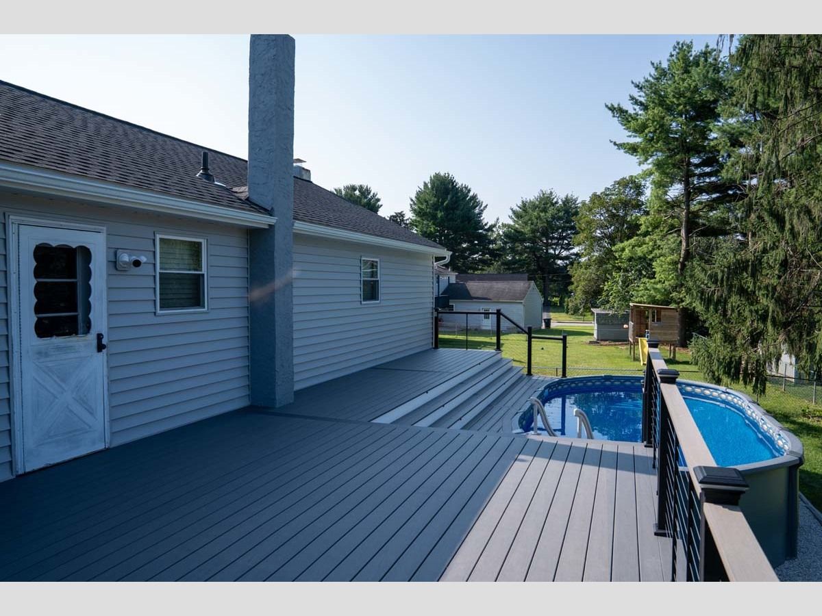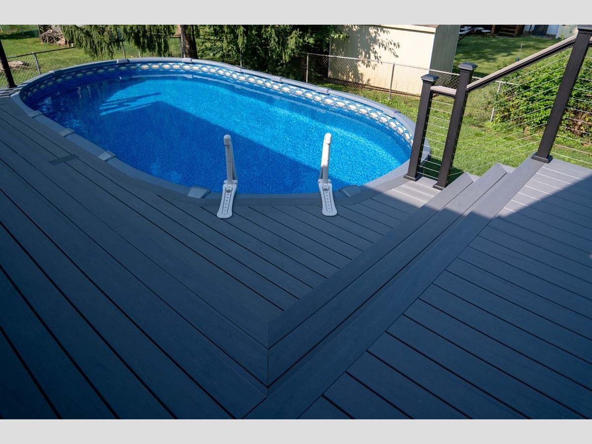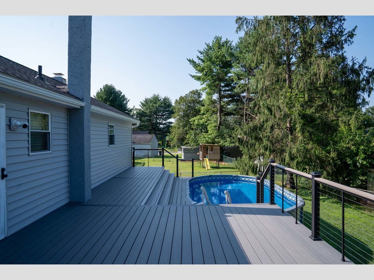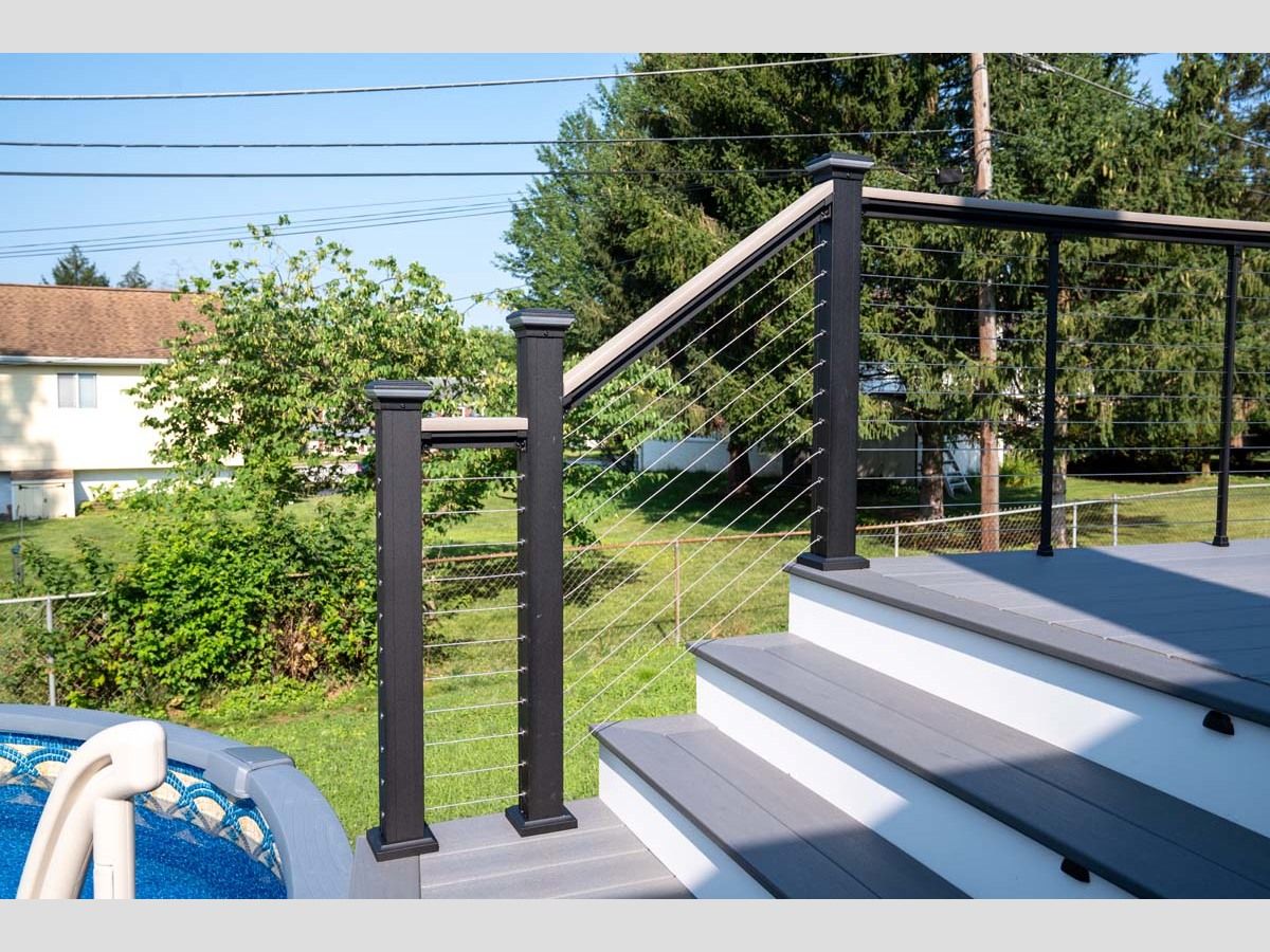 This new pool deck completes the outdoor experience for outdoor living by the pool. Using Trex Transcend Lineage in an Island Mist color with Key-Link. Including Chesapeak Series cable railing in textured black with Island Mist deck board top cap.
