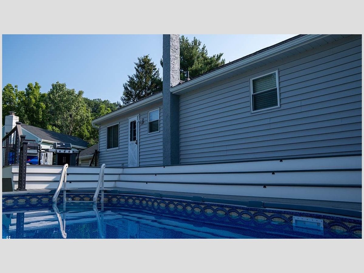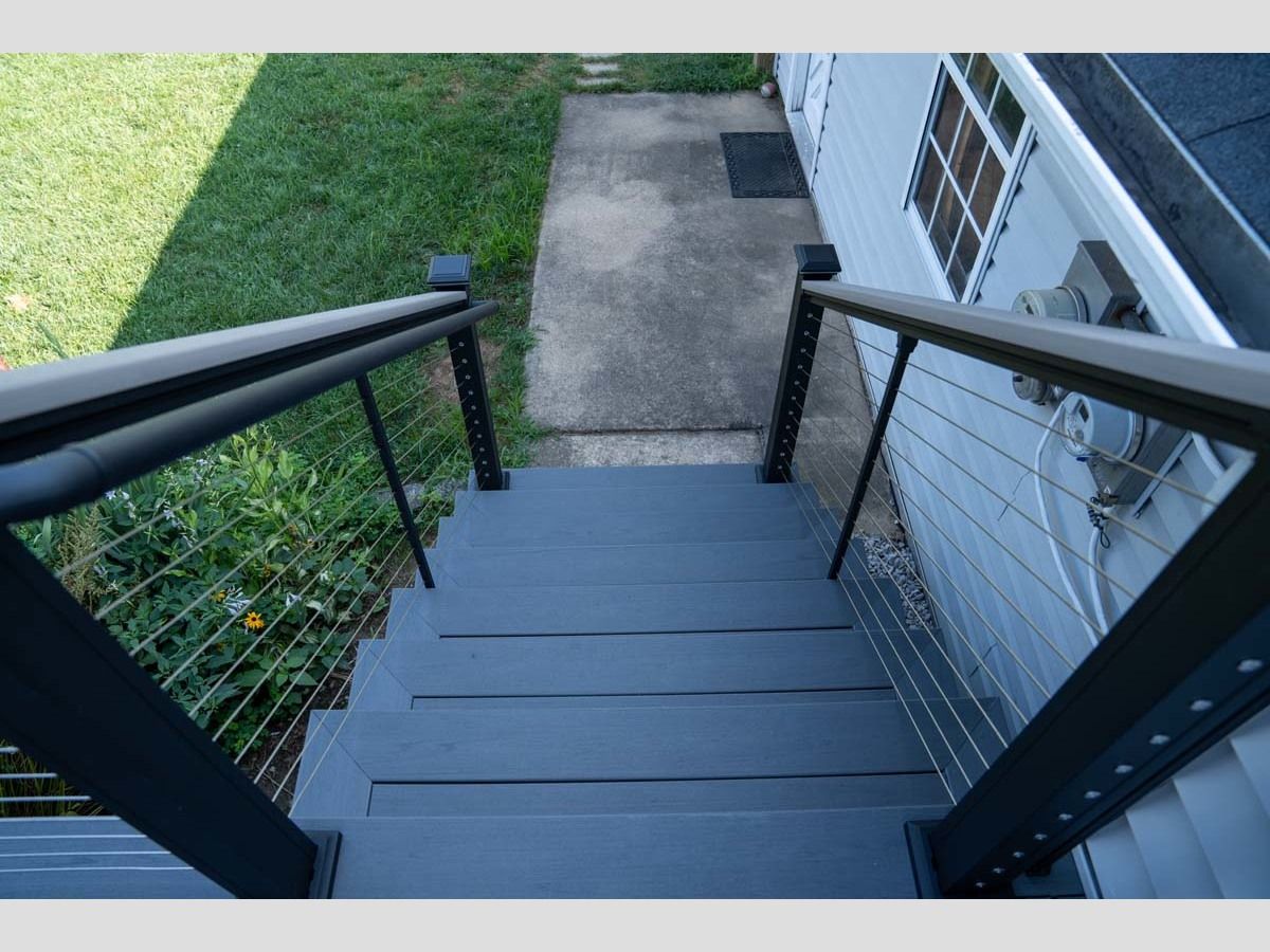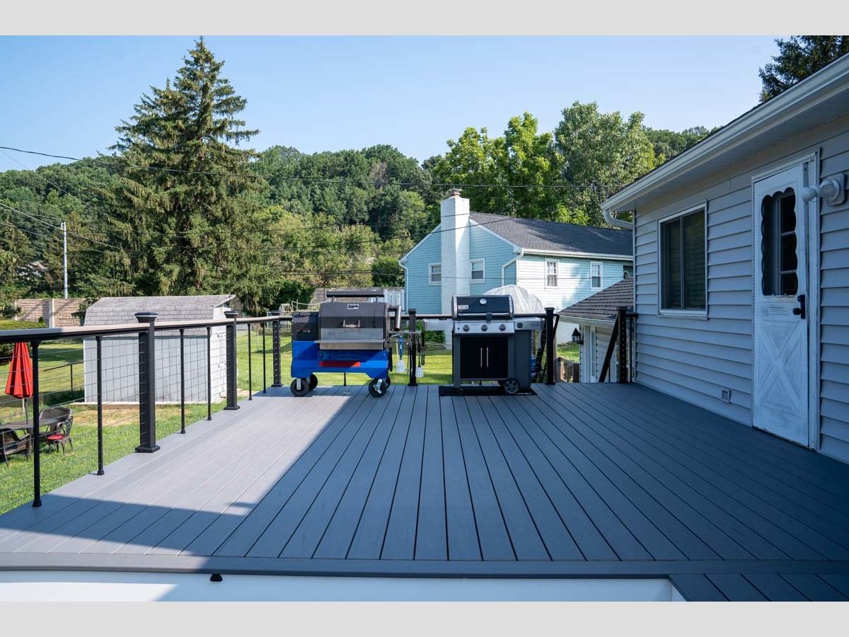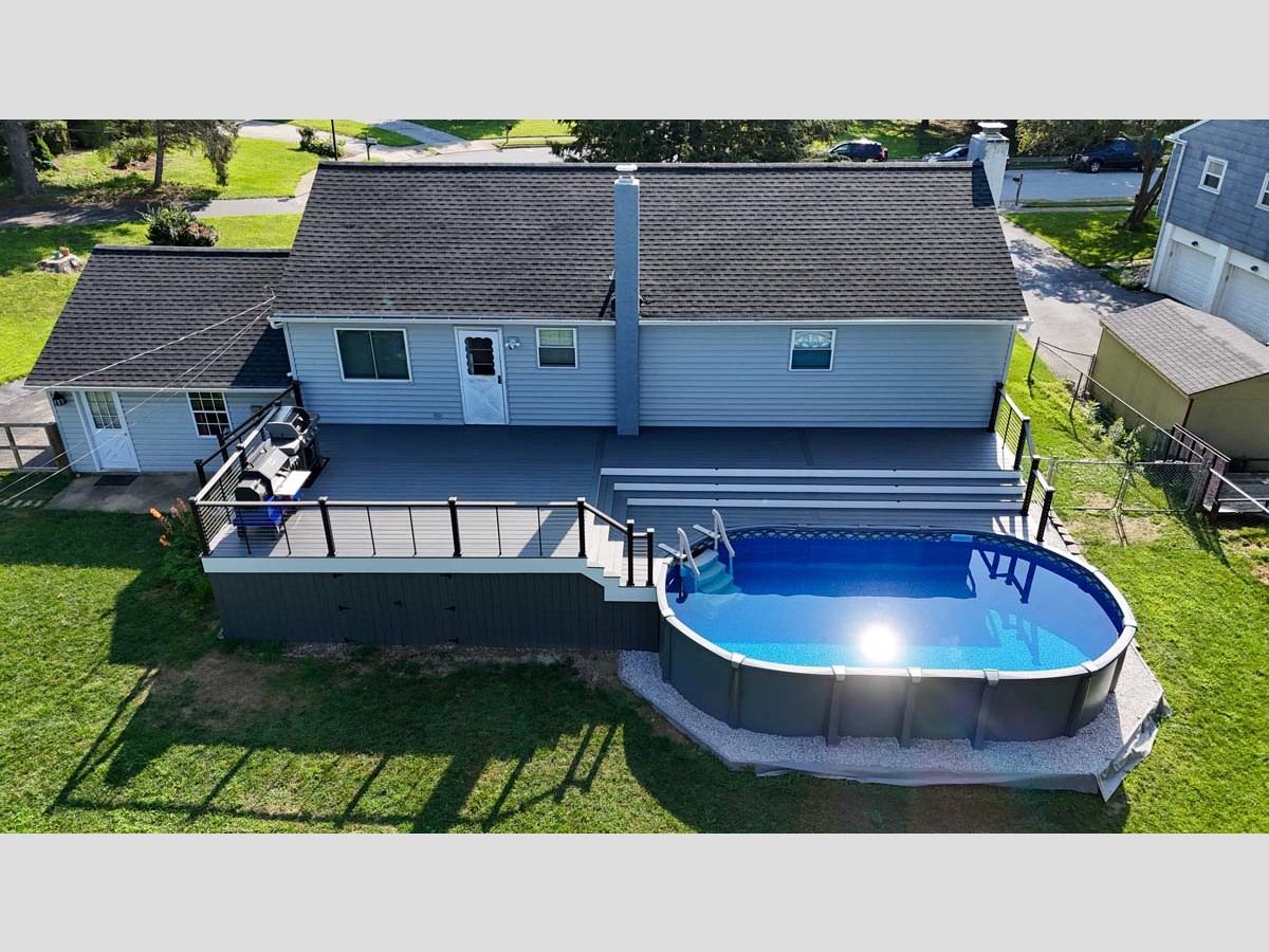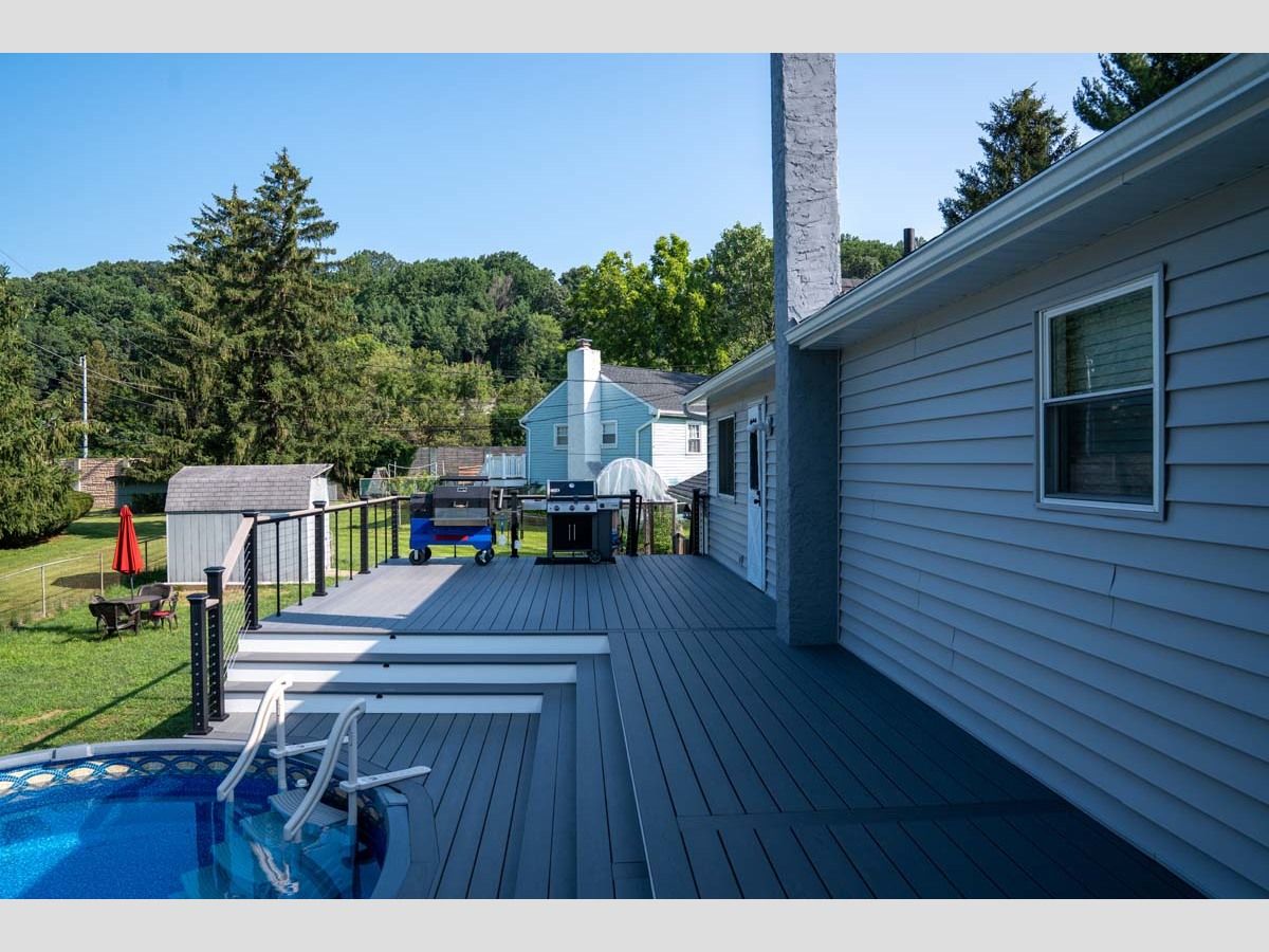 This new pool deck completes the outdoor experience for outdoor living by the pool. Using Trex Transcend Lineage in an Island Mist color with Key-Link. Including Chesapeak Series cable railing in textured black with Island Mist deck board top cap.